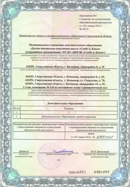 • Места осуществления образовательной деятельности по дополнительным образовательным программам: 624351, Российская Федерация, Свердловская область, город Качканар, 8 микрорайон, дом 25;624351, Российская Федерация, Свердловская область, город Качканар, ул. Свердлова, дом 7 б;624351, Российская Федерация, Свердловская область, город Качканар, улица Свердлова, дом 34, Дворец единоборств "Атлант"